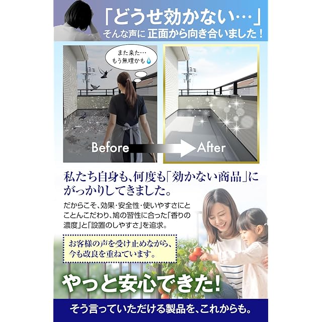 【天然香料で安全安心・国内製造】子供やペットへの影響がない植物由来の安全成分。人には優しくハトを寄せ付けない環境を作る鳩よけ忌避剤です。徹底的に品質管理された国内工場で製作しておりますので、安心してご利用いただきます。