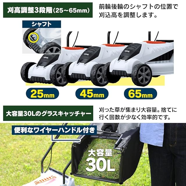 ◆キレイに芝草を刈るコツはゆっくりと刈る 1mを4秒くらいで刈るのが目安です。長い芝草は段階的に短く刈る 芝草が長い場合は刈込高さを調整し段階的に刈りましょう。コンセントに近い方から刈る 延長コードが邪魔になりにくくスムーズです。角度を変えて繰り返し刈る 芝目が一定方向になるのを防ぎ、ムラなく刈る事ができます。◆大容量30Lのグラスキャッチャー刈った草が集まるグラスキャッチャーは30Lと大容量。捨てに行く回数減で効率UP! 便利なワイヤーハンドル付き。