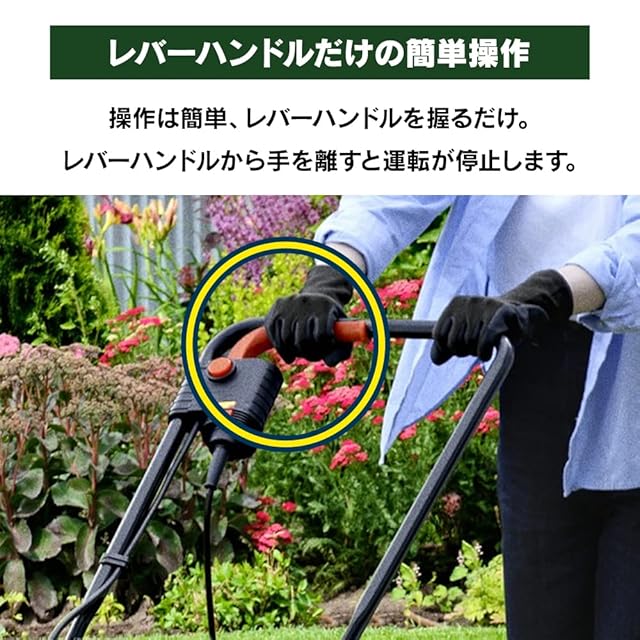 気持ち良くグングン刈れる! お手入れラクラク、手軽なロータリー式。スピーディに芝刈りができます。安心の安全ロックとブレーカー付き・簡単操作レバーハンドル・バッテリー切れの心配なし、AC電源式。小回りが利く軽量コンパクト7kg・大容量30Lのグラスキャッチャー。お手入れ楽々ロータリー式