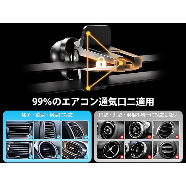 【頑丈なエアベントクリップ】強力なエアベントクリップと固定アームにより、デコボコの道でもしっかりと固定でき、安定性を向上させます。ほとんどの横及び縦の出口と互換性があります。ご注意: 円形の出口に対応しません。