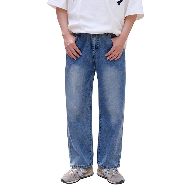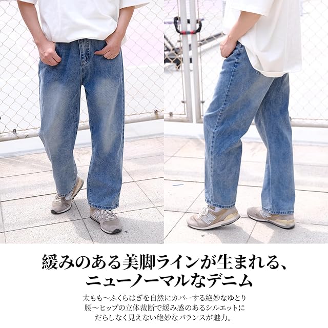 [22 Wear] ジーンズ メンズ ズボン ワイド デニムパンツ ジーパン ゆったり ルーズ ウォッシュ ダメージ (ミディアムブルー S)