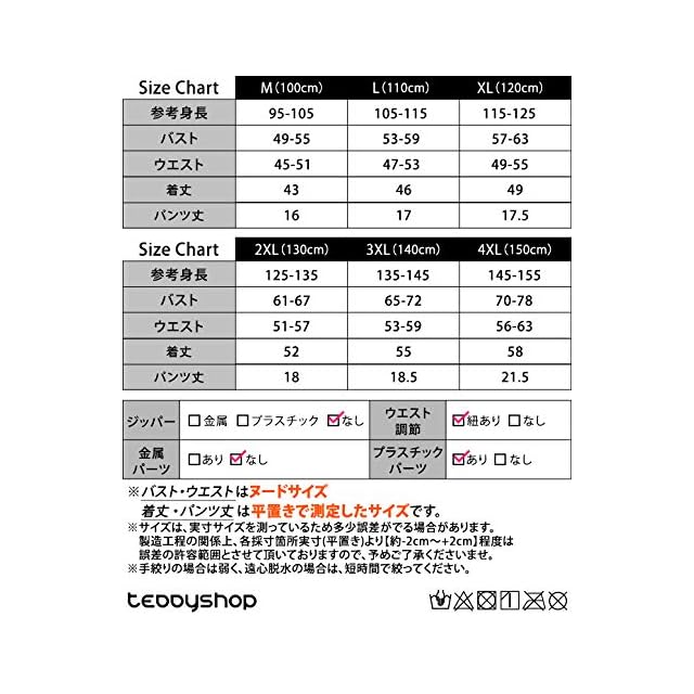 Size M(100cm) 参考身長 95-105 バスト 49-55 ウエスト 45-51 着丈 43 パンツ丈 16