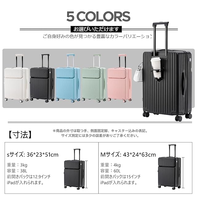◆【寸法情報】Sサイズ:全体外寸36cm x 23cm x 51cm 本体重量:約3kg 容量:約38L(1~3泊対応)。Sサイズは 機内持込みが可能な 『 3辺合計115㎝以内 』の基準を満たしています。(座席数100席以上の航空機の基準です)。Mサイズ :全体外寸43cm x 24cm x 63cm 本体重量:約4kg 容量:約60L(3~7泊対応)。※商品の外寸は取つ手、側面固定脚、キャスター込みの表記。サイズ測定には多少の誤差がありご了承ください。