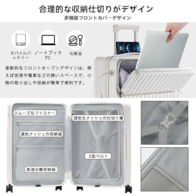 ◆【使い勝手の良い収納スペース】このスーツケースは、フロントオープン部とメイン部の二つの区域で構成されています。①フロントオープン部には、ジッパー付きメッシュポケットとPC用ポケットを備え、必要な物をすぐに取り出せます。②メイン部には、荷物の移動を防ぐX字ベルト固定スペース、ジッパー付きポケット、メッシュポケット、乾湿分離ポケットを装備。荷物の整理が簡単で、スーツケースを開かずに素早くアクセス可能。出張から旅行まで、あらゆるシーンに対応します。