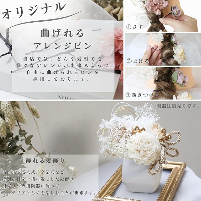 ・【プリザーブドフラワーについて】 当店はあじさいとかすみ草の髪飾りに本物のプリザーブドフラワーを使用しております。 本物ならではの繊細な美しさをご堪能ください。プリザーブドフラワーにつきましては、生花から作られているため 1点1点若干の個体差がありますのでご了承ください。