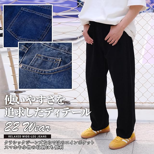 [22 Wear] ジーンズ メンズ ズボン ワイド デニムパンツ ジーパン ゆったり ルーズ ウォッシュ ダメージ (ジェットブラック S)