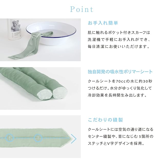 カバーが洗える、天然繊維のしなやかスカーフ。洗えるポケット付きスカーフに冷たい“クールシート”を入れて使うセパレートタイプのスカーフシリーズ。エアリーな生地感に、爽やかな風をイメージしたパステル調のやわらかなトーンのカラーラインナップ。クールシートはパッケージの目盛り(70cc)まで水を入れて30秒間浸すだけで、独自開発の吸水性ポリマーシートが膨らみます。そして含ませた水分をゆっくり気化しながら、長時間首をやさしく冷やします。