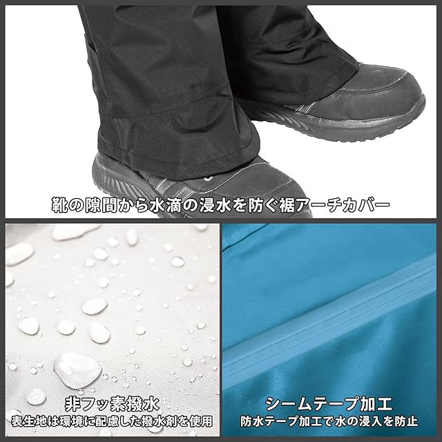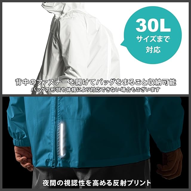 【特徴】背中のファスナーを開けてバッグをまるごと収納可能なレインスーツです。30Lサイズのバッグまで対応(※バッグの形状や体格により対応できない場合もございます)。フード・足元の調整が簡単に行えます。フードの調節コードで頭と首元をぴったりフィット、サイズ調整テープで視界すっきり。フードを丸めて専用テープで立ち襟にもできます。さらにファスナーの内側には正面からの雨や水滴の侵入を防ぐシームテープ加工が施されており、スーツ内部への水滴の侵入を大幅にカットできます。夜間の視認性を高める反射プリント、靴の隙間から水滴の侵入を防ぐ裾アーチカバーを採用。また、表生地は環境に配慮した撥水材を使用しています(非フッ素撥水)。通勤・通学・アウトドアなど様々な場面でマルチにお使いいただけます。