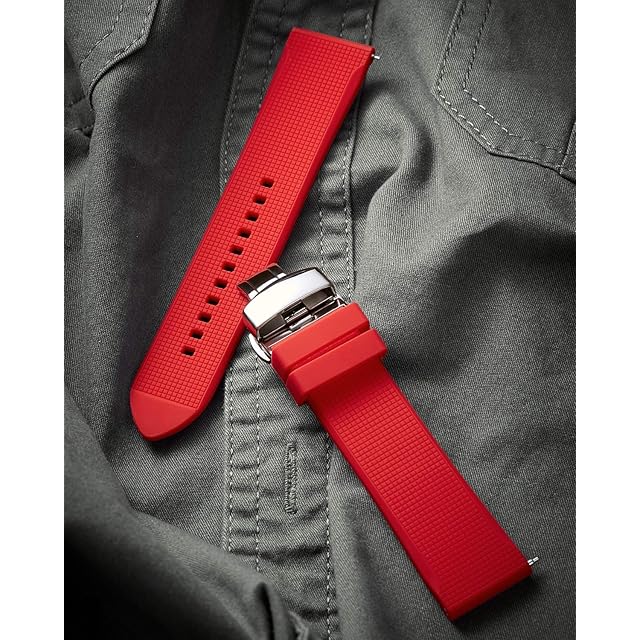 【友好な設計】弊社のシリコン時計バンドは伝統的なピンバックルからアップグレードされて、洗練されたステンレス折り畳み式リリースバックルを採用します。普通のバックルより厚いで、優雅で、丈夫です、もっとしかっりと時計バンドを固定と解放されます。