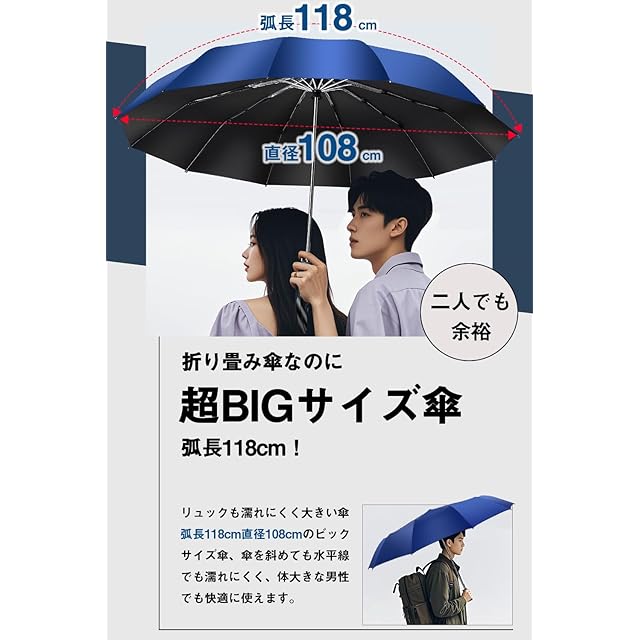 【超大サイズの折りたたみ傘】傘面の曲面長さが116cm、開く直径が103cm、普段の傘より大型化した折りたたみ傘です。体の大きな男性としても窮屈さを感じることなく快適に使えます。雨を防げる範囲が大きくので、二人で荷物を持って傘に入っても余裕があるほどの大きさです。梅雨はもちろん、豪雨、強風にも安心できまる12本骨おりたたみ傘です。