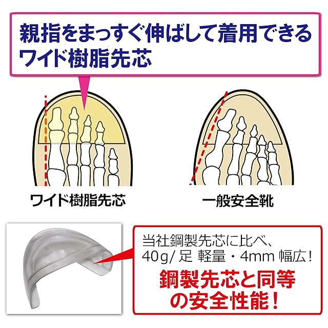 [材質] 先芯:ワイド樹脂、甲被:人工皮革/メッシュ、中敷:PEカップインソール(抗菌・防臭)、靴底:EVA/合成ゴム(エアクッション)