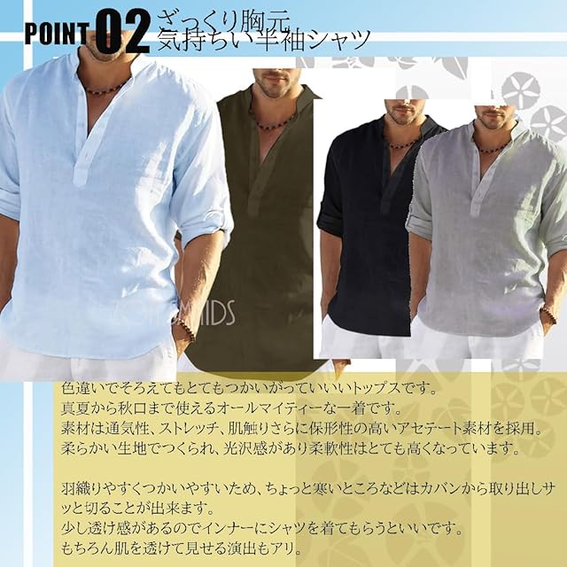[ ゾンスマイズ ] リネン トップス 夏 綿 麻 5分袖 t T シャツ 無地 襟 風 ドロップ ショルダー カットソー メンズ