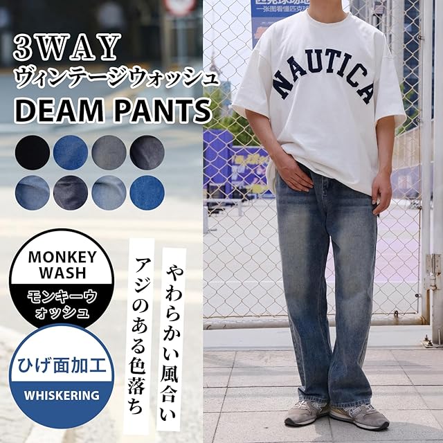 [22 Wear] ジーンズ メンズ ズボン ワイド デニムパンツ ジーパン ゆったり ルーズ ウォッシュ ダメージ (ヴィンテージブルー S)