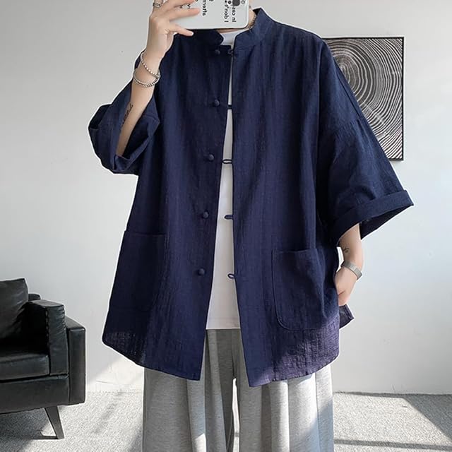 [YEOREO] シャツ チャイナ服 メンズ シャツ メンズ 半袖 無地 七分袖 綿麻 中華服 トップス カジュアル 茶師服 演舞 ゆったり シンプル 中華風 チャイナボタン 大きいサイズ 唐装 夏春服 カンフー服 太極拳服 武術 男女兼用-lan-L