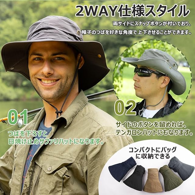 【2WAY仕様スタイル】両サイドにスナップボタンが付いており、帽子のつばを好きな角度で上下させることができます。 (1)サイドのボタンを留めれば、テンガロンハットにもなります。 (2)つばを下ろすと日焼け止めサファリハットになります。