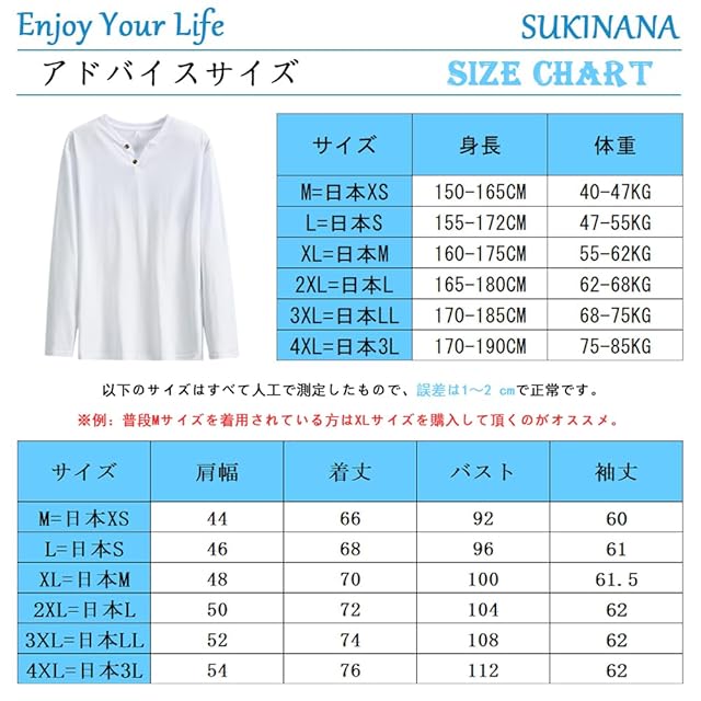 ご注意点」サイズの参照:M =日本XS、身長の目安:155-170cm、体重:40-50kg。L =日本S、身長の目安:160-172cm、体重:50-55kg。XL =日本M、身長の目安:165-175cm、体重:55-62kg。2XL =日本L、身長の目安:168-180cm、体重:62-70kg。3XL=日本LL、身長の目安:173-185cm、体重:70-75kg。4XL=日本3L、身長の目安:178-195cm、体重:75-85kg。※例:普段Mサイズを着用されている方はXLサイズを購入して頂くのがオススメ)。ゆったりとした着心地がお好みの場合は、1サイズ大きめをお選びください。
