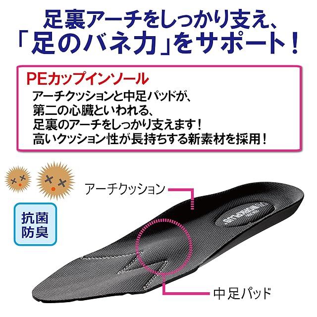 [材質] 先芯:ワイド樹脂、甲被:人工皮革/メッシュ、中敷:PEカップインソール(抗菌・防臭)、靴底:EVA/合成ゴム(エアクッション)