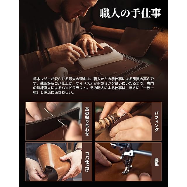 「栃木レザーとは?」栃木レザーは「原皮」から、「革」になるまで、20以上もの工程があります。手間と時間をかけ、伝統の独自の鞣し方法で、丈夫な革を生み出しています。栃木レザー長財布は上質な風合いは高級感を漂わせて、しなやかで手触りがよく、丈夫な作りをしています。年月が経つにつれて味わい深くなり、手に馴染む高品質なレザーです。さらに、人気なYKKラウンドファスナーを使用しており、長期間の使用にも安心してお使いいただけます。