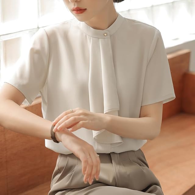 [SPRING SEAON] ボウタイブラウス 半袖 スカーフタイ レディース リボン きれいめ カットソー トップス オフィス ビジネス フォーマル スーツインナー 通勤 普段着 とろみ 大きいサイズ アイボリー M