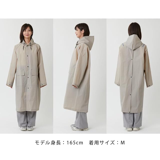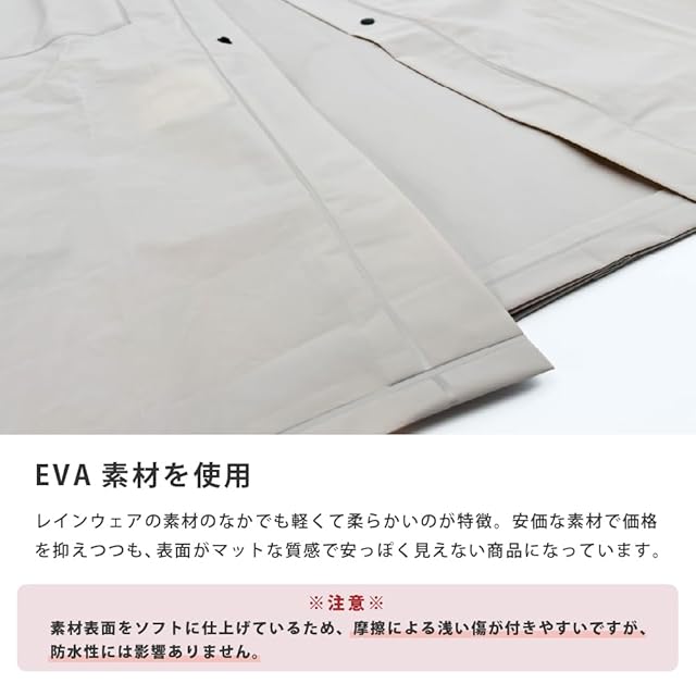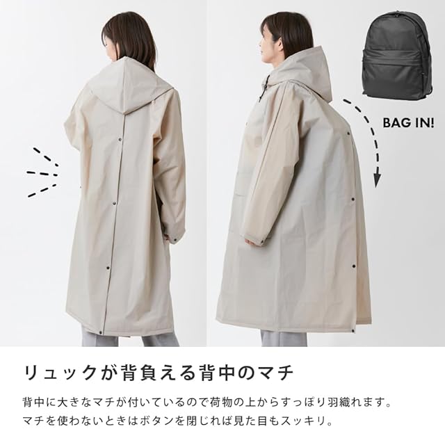 軽量で耐久性の高いEVA素材を使用した、リュック対応のロング丈レインコートです。背中に大きなマチが付いているので、リュックの上からもすっぽり羽織れます。