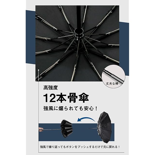 【アルミ合金構造メンズ傘】折りたたみ傘 は頑丈なアルミ合金とグラスファイバーで作られた12本骨折りたたみ傘です。柔軟性と強度を併せ、耐風性と耐久性ともに向上させた折り畳み傘です。空気力学に基づいて風を受け流す構造で設計されているので、強い風でびっくり返っても元に戻ります。また、コーティングを噴霧しているので錆びることは心配がありません。