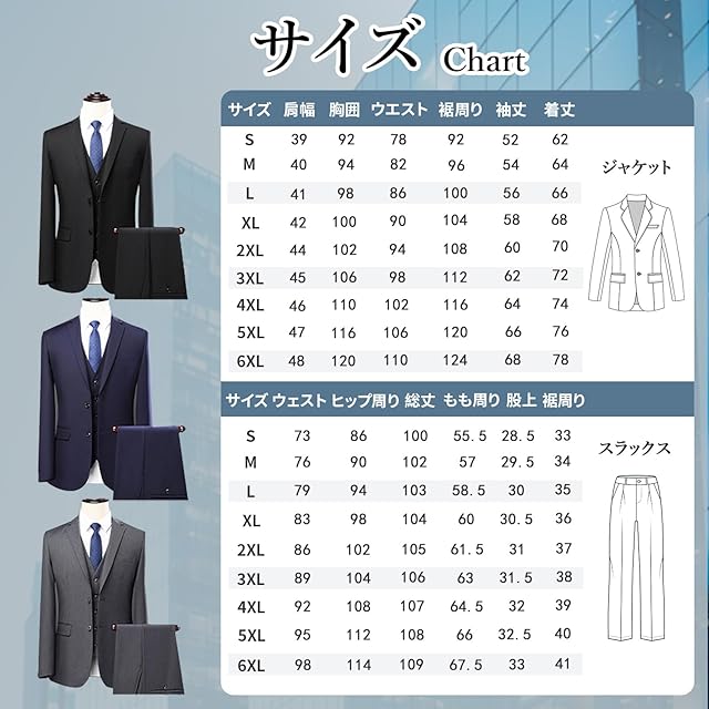 【シルエットについて】ボディラインを美しくスタイルアップするスリムシルエット、ウエストを絞った細身効果で洗練された大人のビジネスマンに。膝下からタイトになるスラックスはテーパードシルエットで脚長効果。