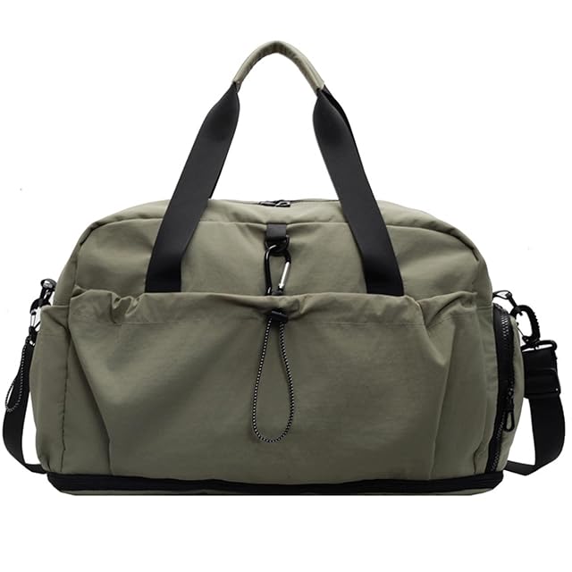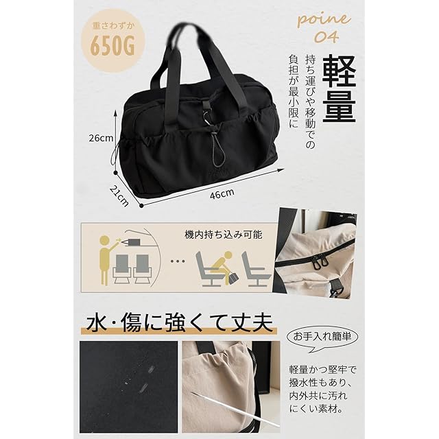 【軽量で機能的な素材】 軽量なナイロン生地を使用し、カバン内の荷物をしっかり守ります。内部には濡れたものを収納できる防水ポケットがあり、側面には靴を収納できるポケット、反対側には調節可能なサイドポケットを備えています。また、背面には行李箱に掛けられる機能があり、さらに便利なファスナーポケットも付いています。