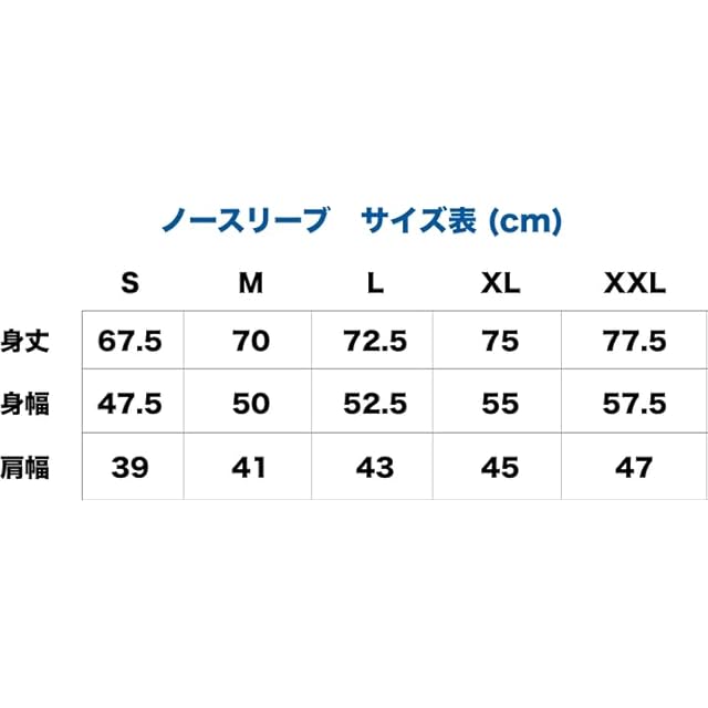 Sサイズ 着丈67.5cm, 身幅47.5cm, 肩幅39cm; Mサイズ 着丈70cm, 身幅50cm, 肩幅41cm; Lサイズ 着丈72.5cm, 身幅52.5cm, 肩幅43cm; XLサイズ 着丈75cm, 身幅55cm, 肩幅45cm; XXLサイズ 着丈77.5cm, 身幅57.5cm, 肩幅47cm