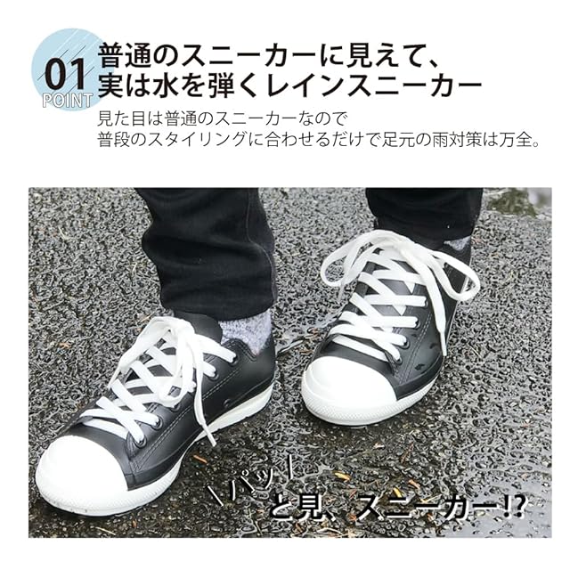 【普通のスニーカーに見えて、実は水を弾くレインスニーカー】見た目は普通のスニーカーなので普段のスタイリングに合わせるだけで足元の雨対策は万全。