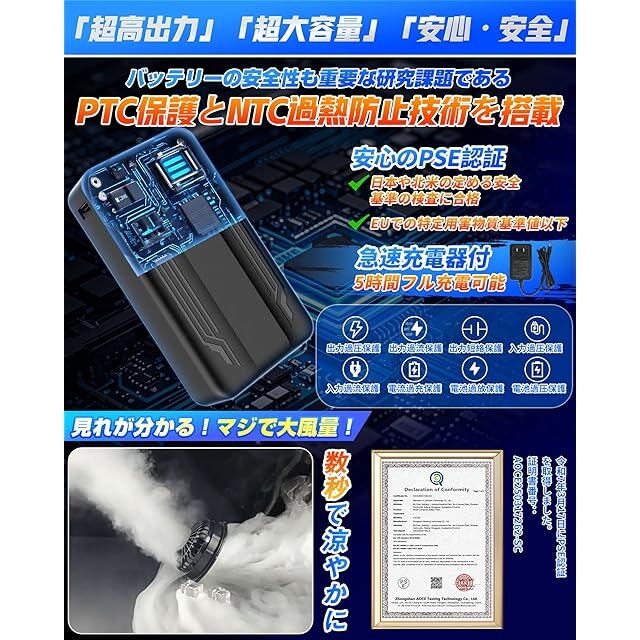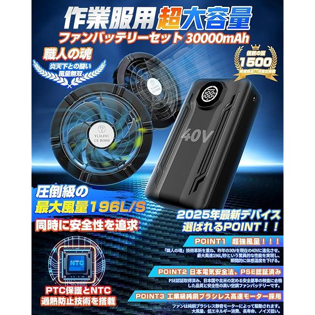 空調作業服 ファンバッテリーセット 【40V 超高出力 超強風 30000mAh】 最大20時間連続稼働 5段階風量調節空調作業服 ファン バッテリーセット 専用DC充電器 PSEマーク認証済 熱中症対策 日本語説明書付き【9cm服穴径対応】
