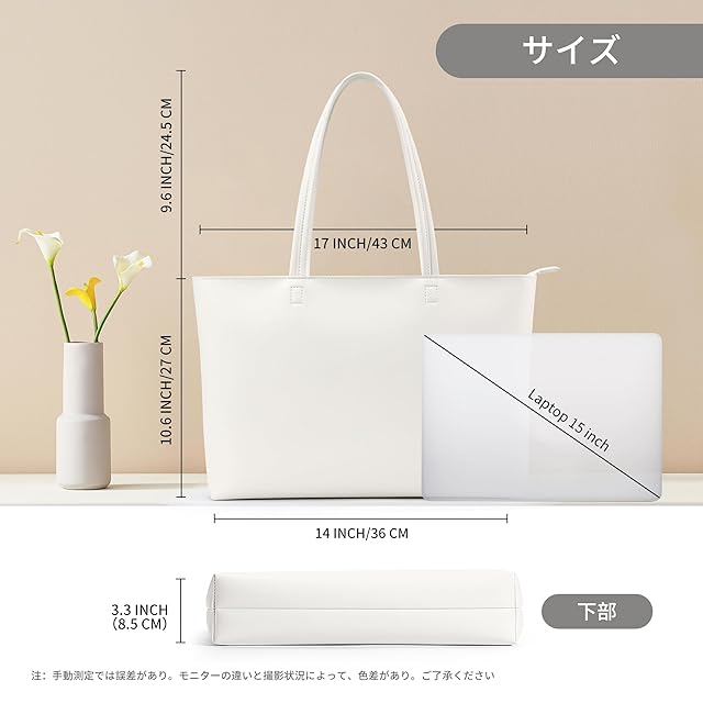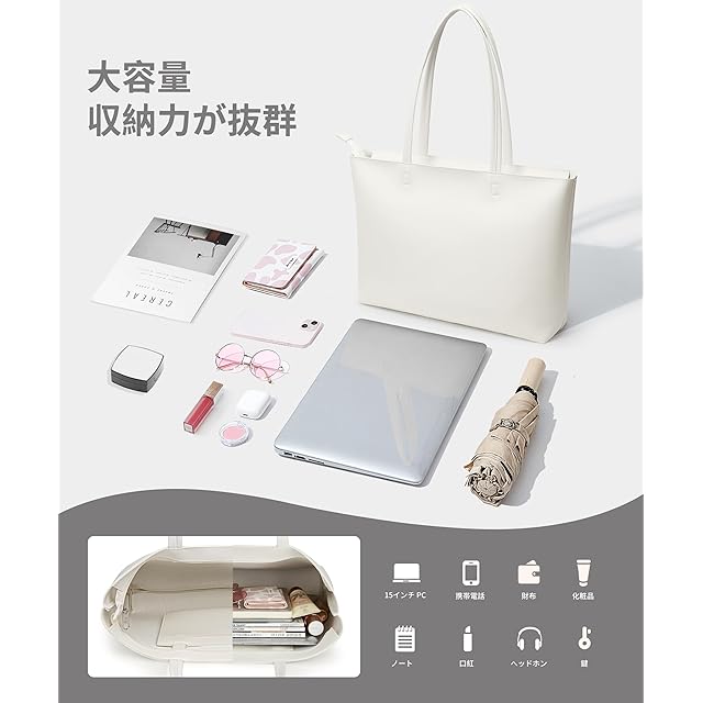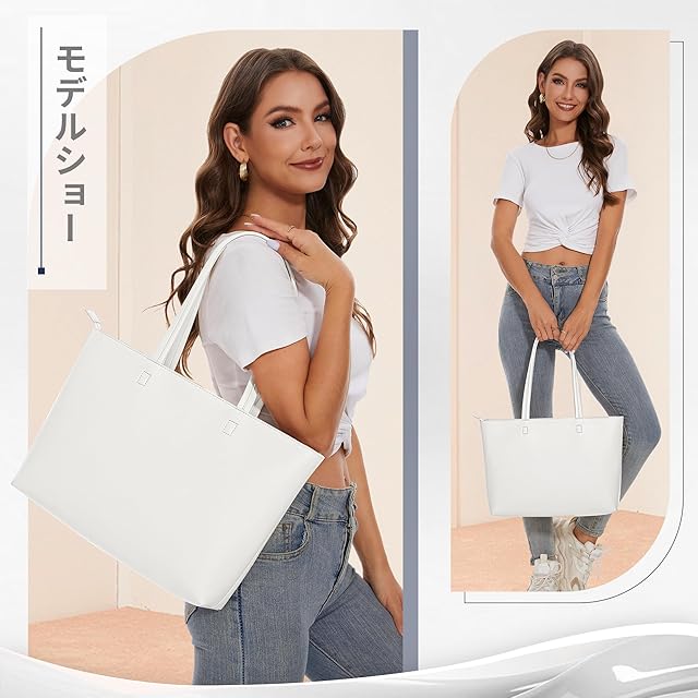 [KALIDI] トートバッグ ショルダーバッグ 大容量 レディース メンズ 肩掛けバッグ 大きめ エコレザー 合皮 シンプル 無地 A4 横型 男女兼用 ビジネス 内ポケット有り ファスナー付き (ホワイト)