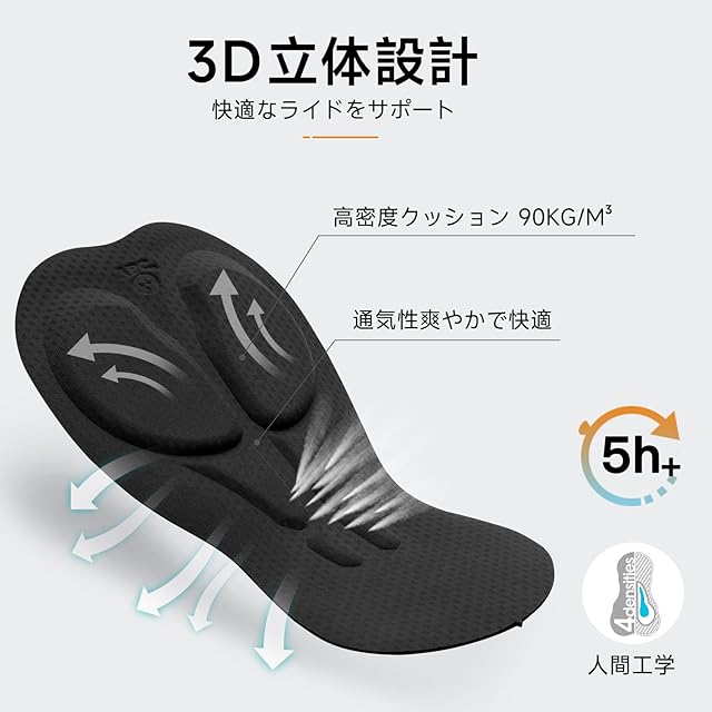 人体工学に基づいたデザインで、体にフィットし、動きを妨げません。パッド部分は高密度クッションを使用し、お尻への負担を軽減。