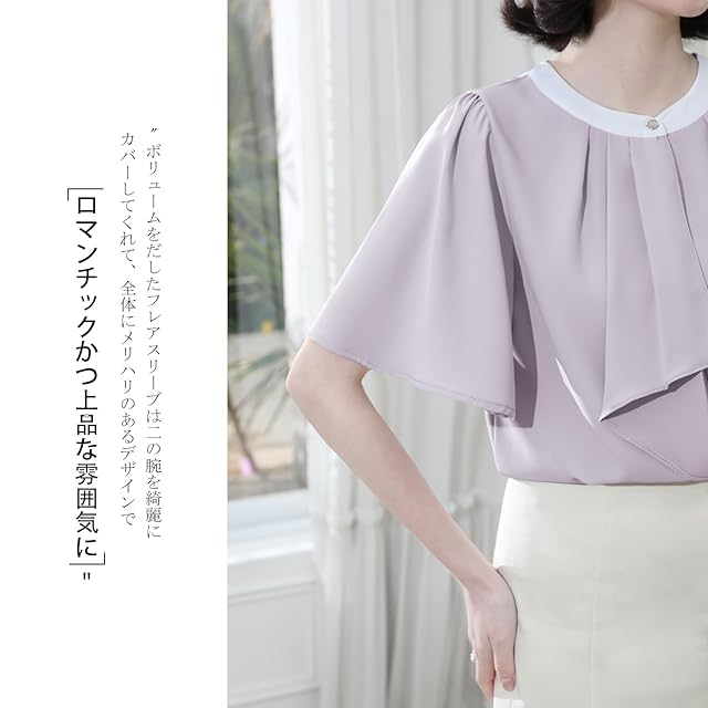 さらっとした生地感で肌に優しくて着心地がよく、薄手すぎずに通気性がいいのもうれしいポイントです。肩の微細なギャザーがボディラインを整えつつ、顔周りも華やぎます。ボリュームをだしたフレアスリーブは二の腕を綺麗にカバーしてくれて、全体にメリハリのあるデザインで、ロマンチックかつ上品な雰囲気に。ゆったりしたシルエットは着痩せ効果はもちろん、長時間のデスクワークや通勤歩行でも快適さを持続できます。