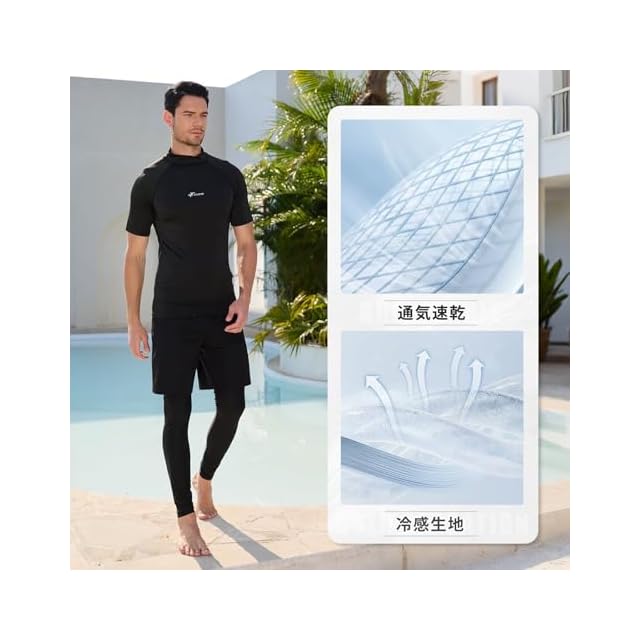 冷感・UV カット・通気速乾機能:特殊な冷感素材で、着用するとすぐに爽やかな涼しさを感じられます。高い UV カット機能で日焼けを効果的に防ぎ、通気性と速乾性にも優れているため、汗や海水に濡れてもすぐに乾き、常に快適な着心地を維持できます。