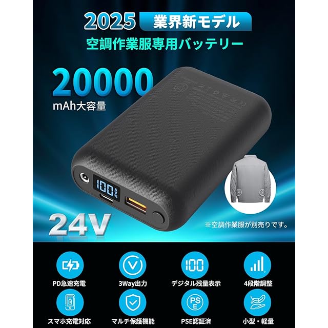 [Gorbobo] 空調作業服バッテリー 24V超高出力 20000mAh モバイルバッテリー Type-C双方向急速充電 DC/USB デュアル出力 4段階風量調節 デジタル残量表示 作業服ファン用バッテリー アウトドア/出張/旅行/緊急用/災害 停電対策 防災グッズ (24V 20000mAh)