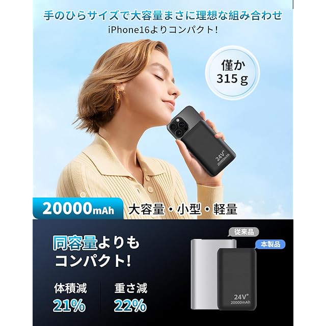 【デジタル残量表示&超小型・軽量設計】高視認性LEDディスプレイ搭載、バッテリーの電源ボタンを短押しすると、バッテリー残量や電圧がデジタル表示されます。 0~100の数字で残量が一目でわかります。20000mAhバッテリー大きさは約11*6.9*2.8cmの超小型サイズです。約315g軽量で、カバンやポケットに入れて、持ち歩きにも負担がありません。機内へ持ち込みOKなので、外出時や旅行時用の予備に活躍してくれます。