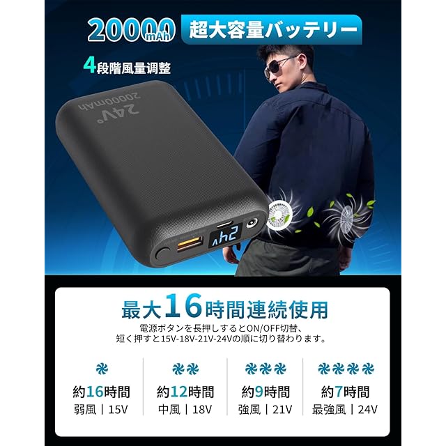 【20000mAh大容量の安心感&24V高出力&4段階風量調整】2025年24V高電圧出力大容量20000mAhが新登場!バッテリーのスイッチを長押しすると電源が入り、短く押すとDC24V-21V-18V-15Vの周回切り替えができます。大容量により、iPhone 14を約6回、Switch約5回の充電が可能です。スマホとタブレットはもちろん、カメラ、USB扇風機、ゲーム機などにも数回に充電できます。