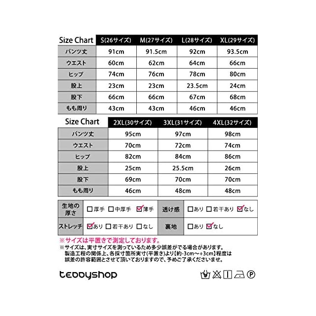 Size 2XL(30サイズ)-パンツ丈-95cm,ウエスト-70cm,ヒップ-82cm,股上-25cm,股下-69cm,もも周り-46cm
