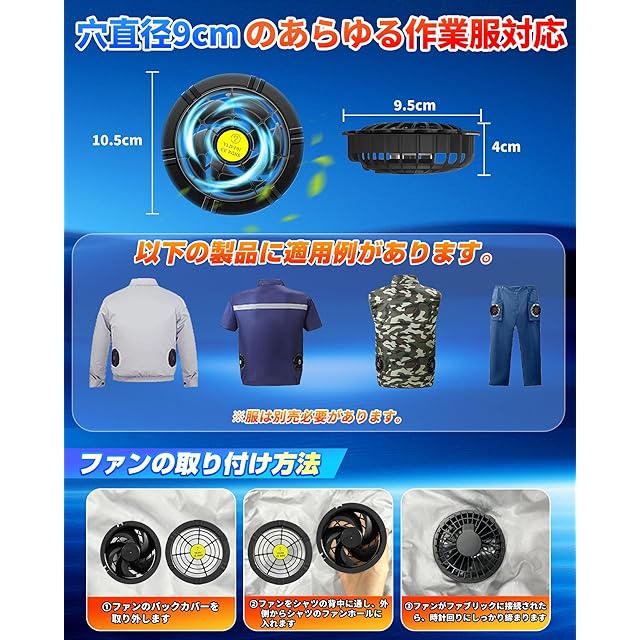 【幅広いシーンで活躍&安心のサポート体制】倉庫作業、建築現場、農業、配送業、釣り、イベント業務まで、春夏のあらゆる屋外活動に最適。ファン装着部直径9c。セット内容:ファン×2、12Vバッテリー×1、充電ケーブル×1、ファン接続ケーブル×1、日本語説明書付き。商品到着後の初期不良、または6ヶ月以内の故障も、迅速に対応いたします。万が一返信が遅れた場合も、お手数ですが再度ご連絡ください。