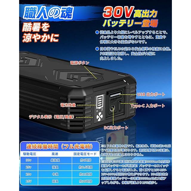 空調作業服 ファンバッテリーセット【30V 超高出力 超強風 30000mAh】最大18時間連続稼働 4段階風速調節空調作業服 ファン バッテリーセット 搭載 Type-C充電器 PSEマーク認証済 日本語説明書付き【9cm服穴径対応】