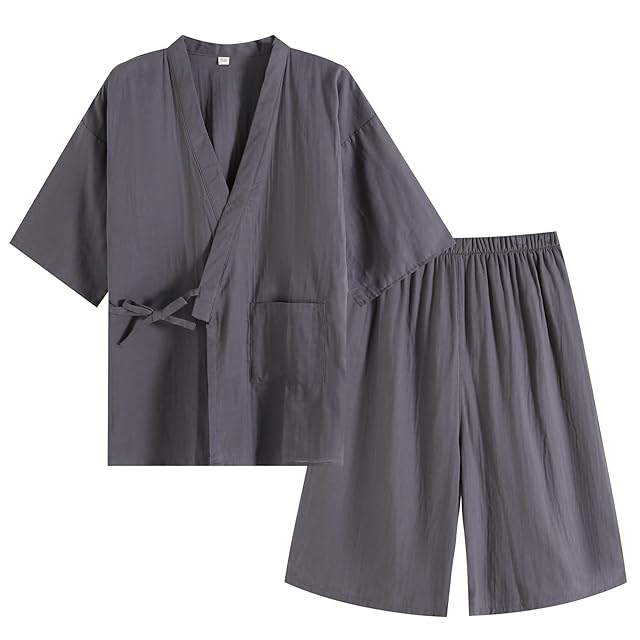 [SISOFTLY] シソフトリー メンズ 七分袖 甚平 無地 春夏用 2重ガーゼ セット 洗える夏着物 作務衣 メンズのパジャマ セット (グレー03,L)