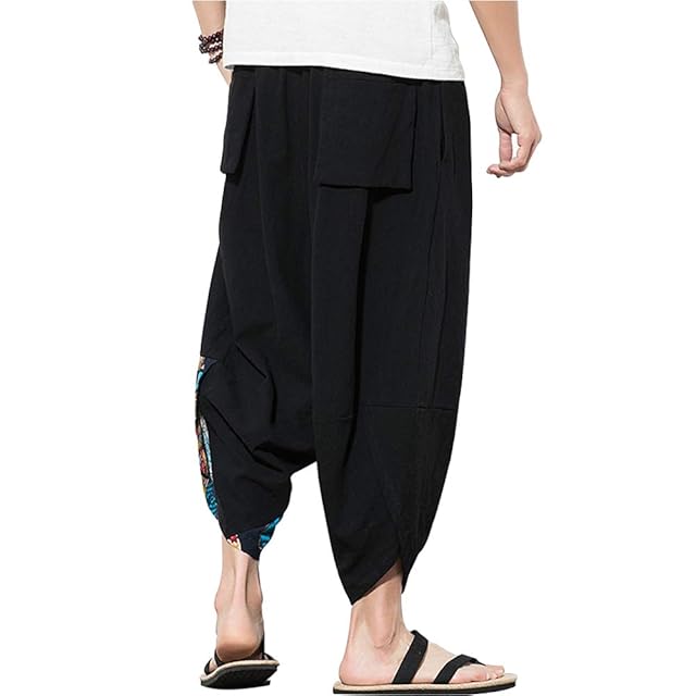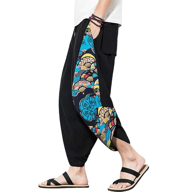 [YFFUSHI] メンズ サルエルパンツ ワイドパンツ アラジンパン メンズ 和風 パンツ M-5XL メンズ 7分サルエルパンツ 七分丈 綿 黒 全6柄 和風 調整紐