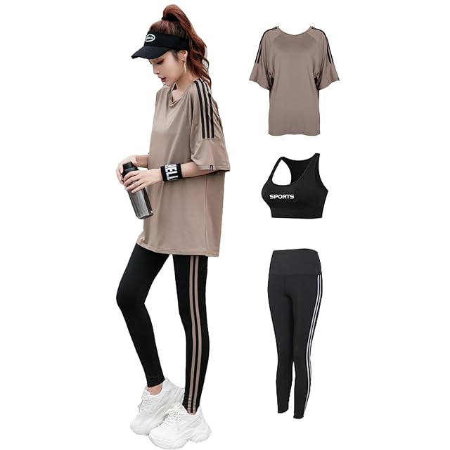 [Sujpjheed] スポーツウェア ヨガウェア ジャージ セット レディース フィットネスウエア 上下3点セット レディース トレーニングウェア アクティブウェア 上下セット レディース 韓国風 体型カバー 大きいサイズ 速乾 吸汗 伸縮性 通気 (カーキ XL)