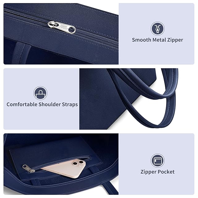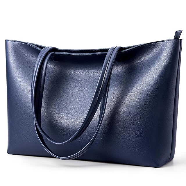 [KALIDI] トートバッグ ビジネス ショルダーバッグ 大容量 レディース メンズ 肩掛けバッグ 大きめ エコレザー 合皮 シンプル 無地 A4 横型 男女兼用 内ポケット有り ファスナー付き (ディープブルー)
