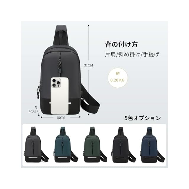 『多彩な収納ポケット』このボディバッグ メンズは、複数の収納ポケットを備えており、日常的に使う小物を整理整頓して収納できます。大容量にもかかわらずコンパクトなデザインで、荷物が多い時でも快適に持ち運びが可能です。