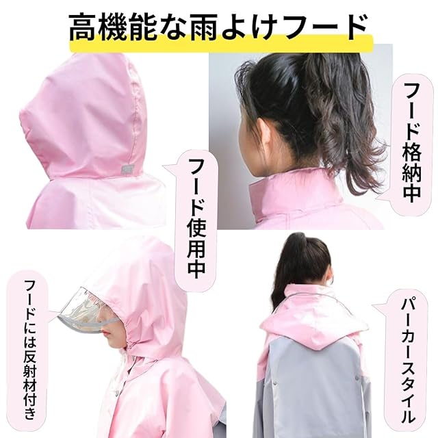 ✅.フードの先にはクリア部を設けて視認性向上。 ✅.背中とフードの一番先には反射材縫込み、夜間でも蛍光塗料が反射して安全。