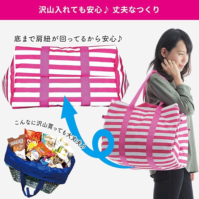 【エコバッグ 折りたたみ】持ち運ぶ時は小さくたたんでバッグイン。重たいものを入れてもバッグが壊れないよう底部まで持ち手を通してあります。バッグだけでも自立するしっかりとした作り!安心して使えます。ピクニックや運動会にも!レジャーバッグとしても使えるLLサイズです。