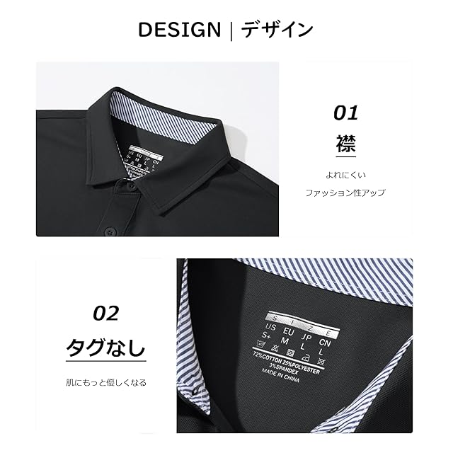 【定番デザイン】①無地:無地の生地でコーディネートが簡単になります。いろんなアイテムと合わせやすいです。②タグなし:タグの違和感を消して肌にもっと優しくなります。③襟:すっきり決まるボタン付きの襟が特徴。特別のデザインを採用しており、よれにくいと同時に、ファッション性がアップ