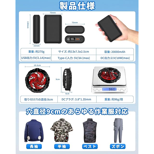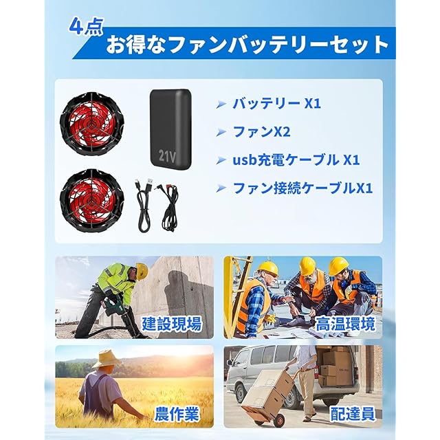 【幅広いシーンで活躍&安心のサポート体制】倉庫作業、建築現場、農業、配送業、釣り、イベント業務まで、春夏のあらゆる屋外活動に最適。ファン装着部直径9c。セット内容:ファン×2、21Vバッテリー×1、充電ケーブル×1、ファン接続ケーブル×1、日本語説明書付き。商品到着後の初期不良、または6ヶ月以内の故障も、迅速に対応いたします。万が一返信が遅れた場合も、お手数ですが再度ご連絡ください。