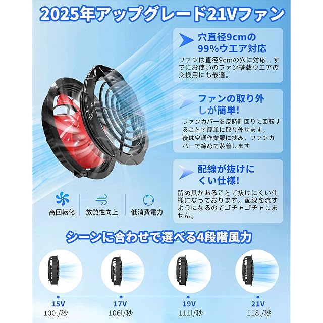【ついに登場!21V超強力ファンバッテリーセット】日本職人の技術が結集した最新作!従来の15Vモデルを大きく超える21V高出力モーターを搭載し、風量は驚異の1.3倍アップ。最大風速118L/秒で、服内に強力な空気循環を生み出し、汗を瞬時に蒸発。過酷な現場や真夏の屋外作業でも、体感温度を素早く下げ、快適さを長時間キープします。これは、現場で働くすべての方に贈る、真の進化系アイテムです!